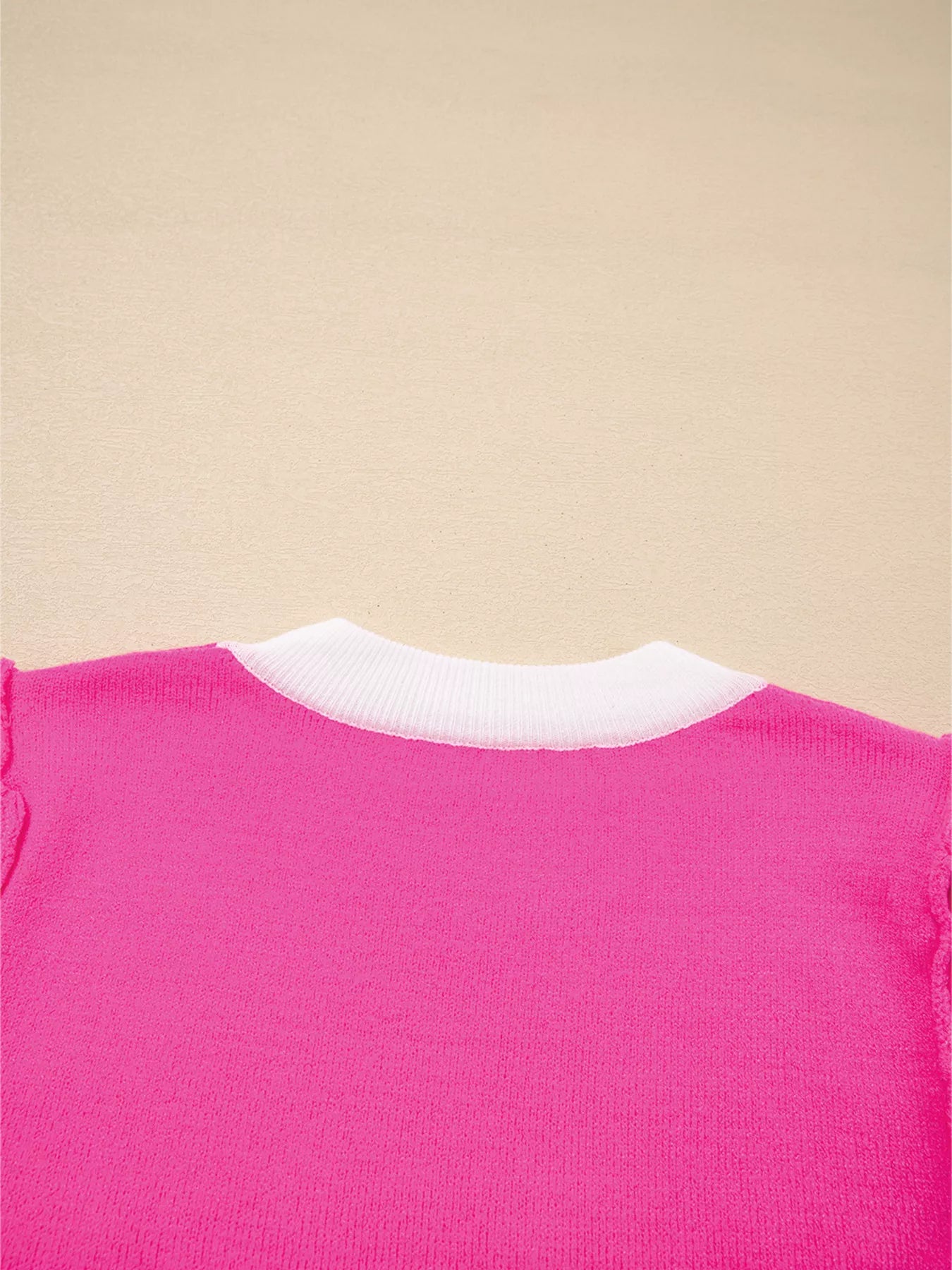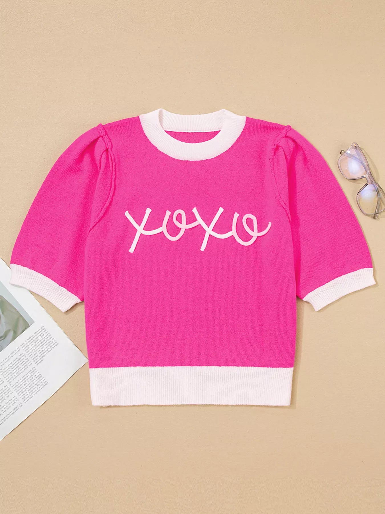 XOXO Valentines Contrast Trim Crew Neck Short Sleeve Sweater